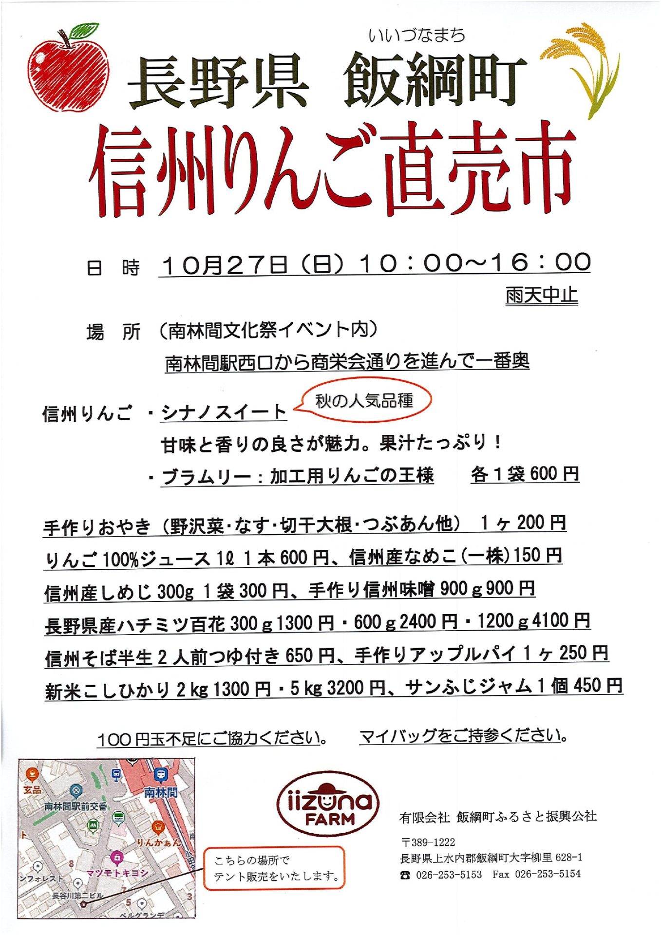 10月27日(日)10:00~16:00(雨天中止) 南林間文化祭イベント内にて、直売市を行います。 りんごをはじめ、手作りおやき、信州そば、新米など ぜひお越しください!ご来場お待ちしております。